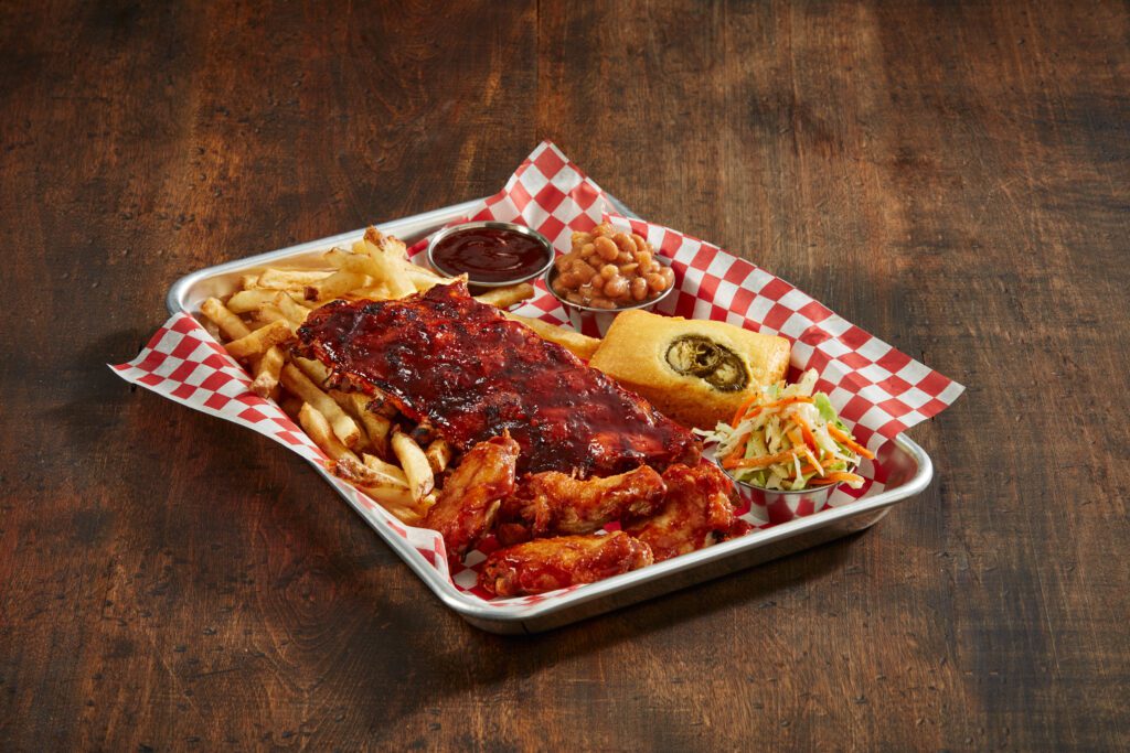 Half rack of fall-off-the-bone BBQ ribs, 4 crispy chicken wings, tossed in your choice of sauce, [BBQ, Buffalo, Sweet & Tangy, Hotter Than Hell, or Salt & Pepper]. Served with crispy bottomless fries, house-made jalapeño cornbread, maple baked beans, and tangy slaw.