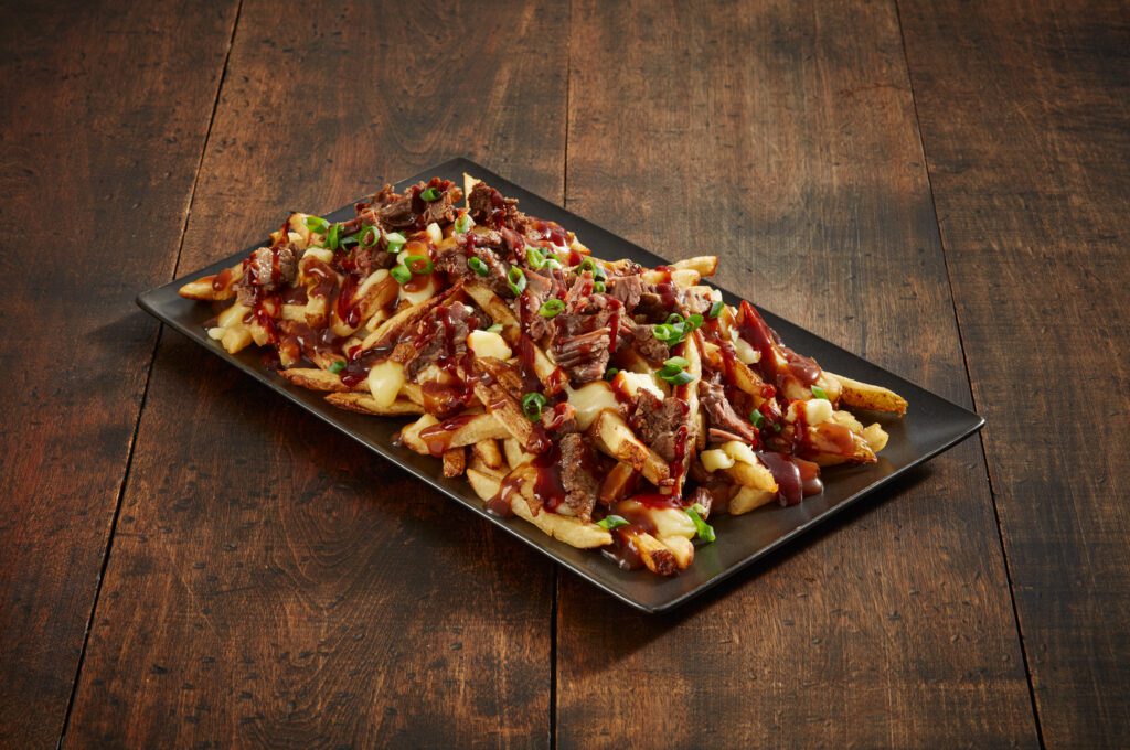 Crispy fries loaded with rich gravy, authentic Quebec cheese curds, thick-sliced, slow-cooked brisket, a drizzle of smoky BBQ sauce, and chopped green onions. 1520 Cals