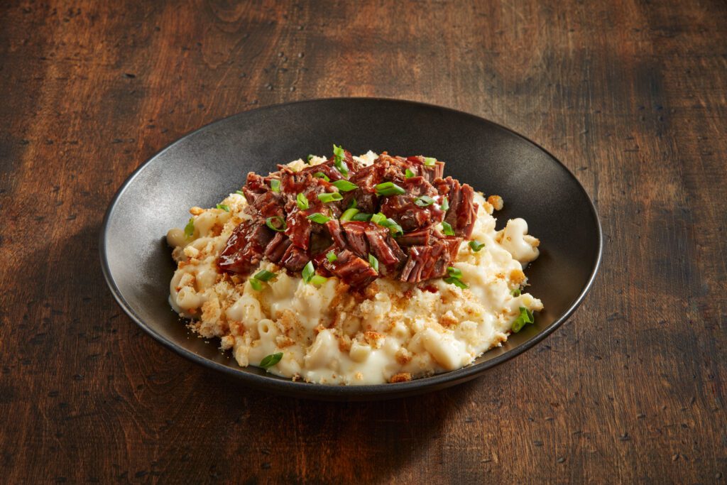 Rich and creamy white cheddar melted with hearty macaroni noodles, finished with toasted seasoned breadcrumbs. Loaded with thick-sliced, slow-cooked brisket, drizzled with BBQ sauce, and topped with chopped green onions.