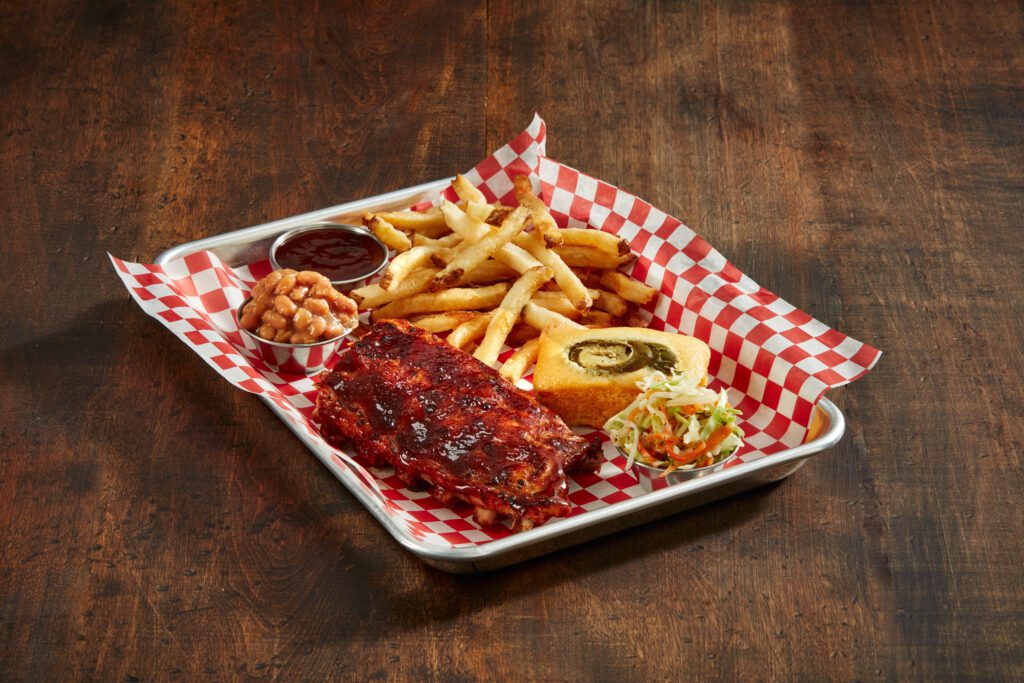 Full rack of tender, fall-off-the-bone BBQ pork ribs. Served with crispy bottomless fries, house-made jalapeño cornbread, sweet maple baked beans, and tangy slaw.