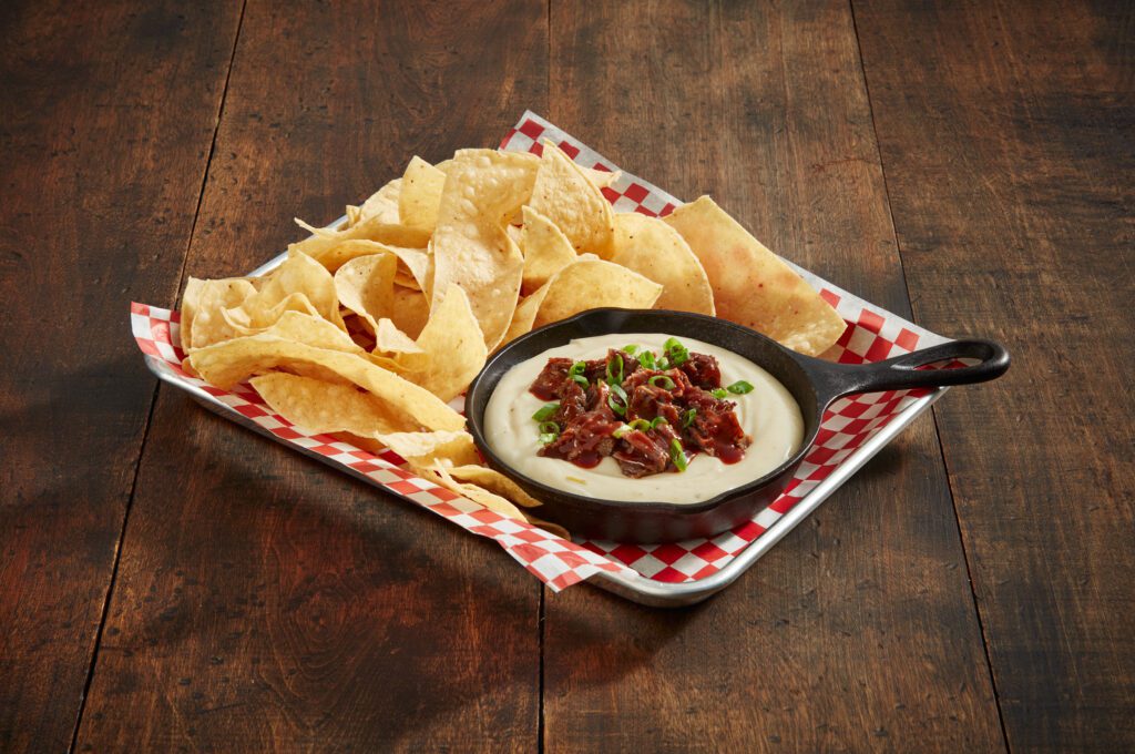Rich, melty white queso topped with juicy slow-cooked brisket with BBQ sauce, and garnished with green onions.