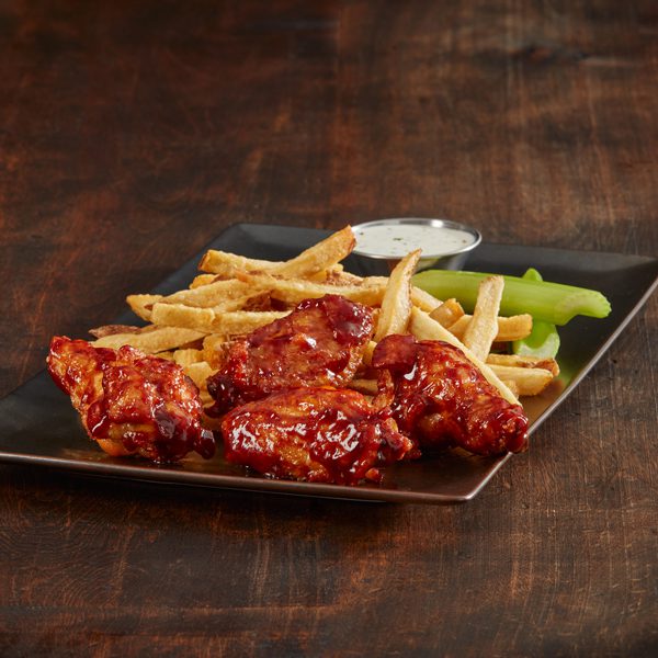 Saucy BBQ wings served hot with a side of crispy golden fries.